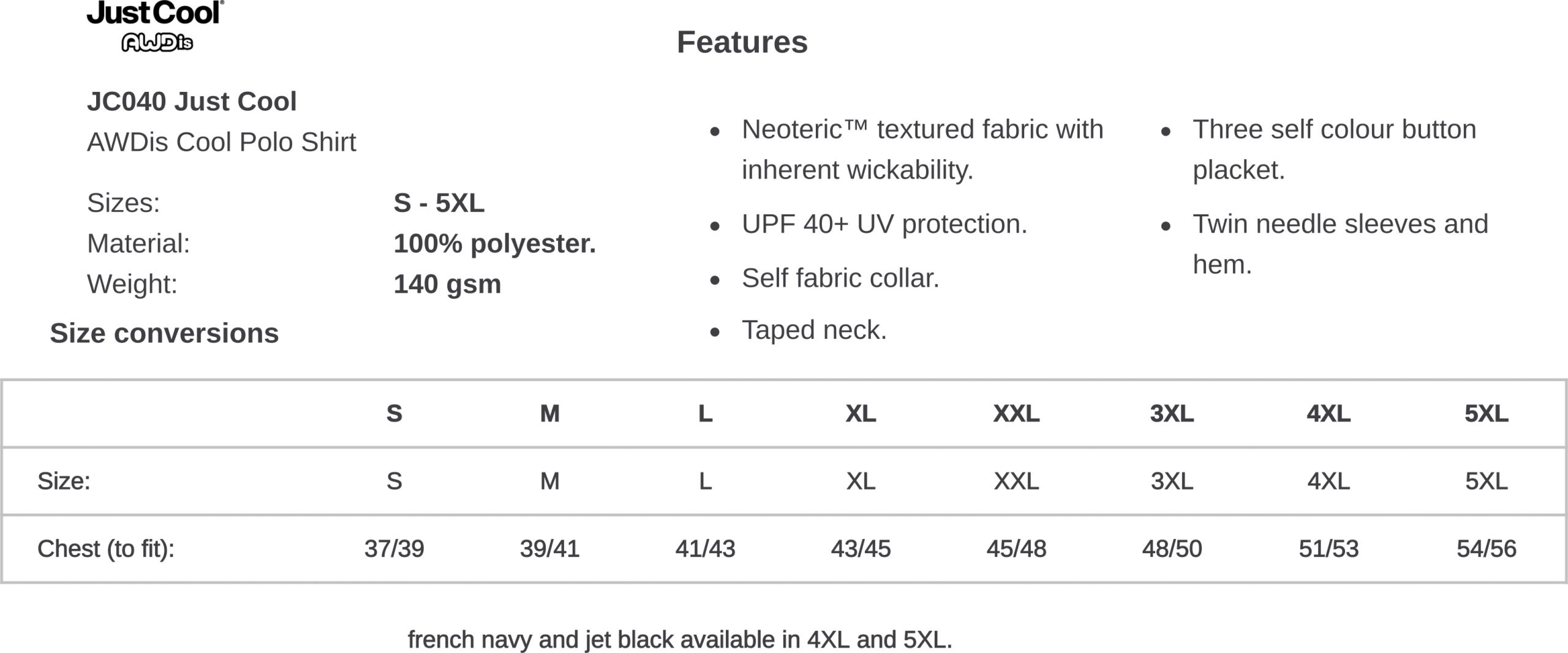 | Colour | Black, French Navy, Royal Blue, Sapphire Blue, Fire Red |