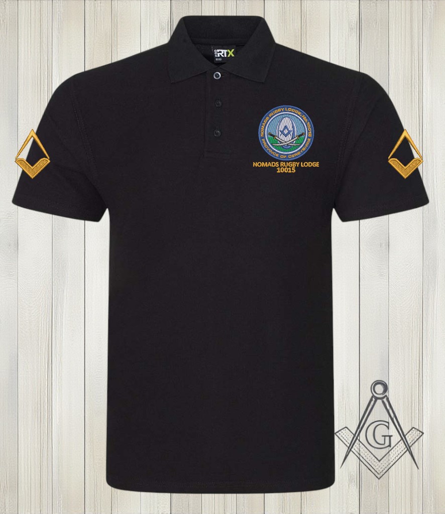 Pro RTX Polo shirt embroidered with Nomads Rugby logo left chest and Square & Compass on each sleeve.